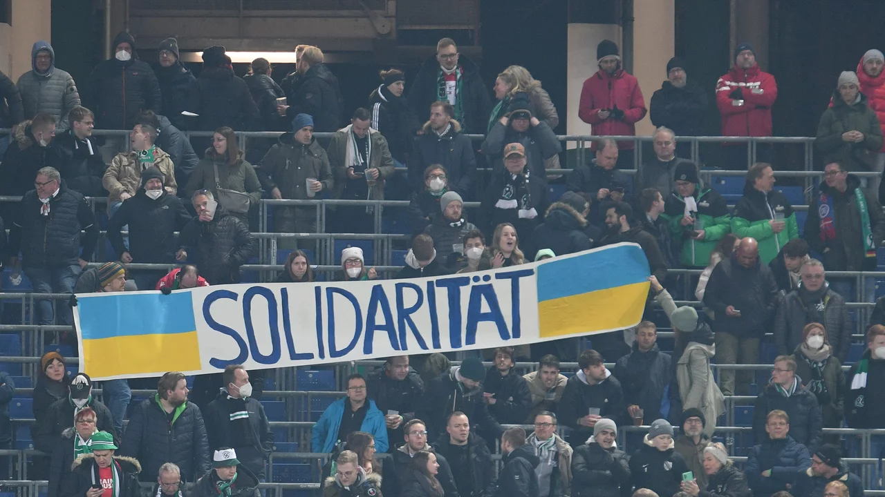 Zum Foto: Fans mit Solidaritätsaufruf beim Viertelfinale DFB-Pokal Hannover 96 gegen RB Leipzig am 02.03.2022