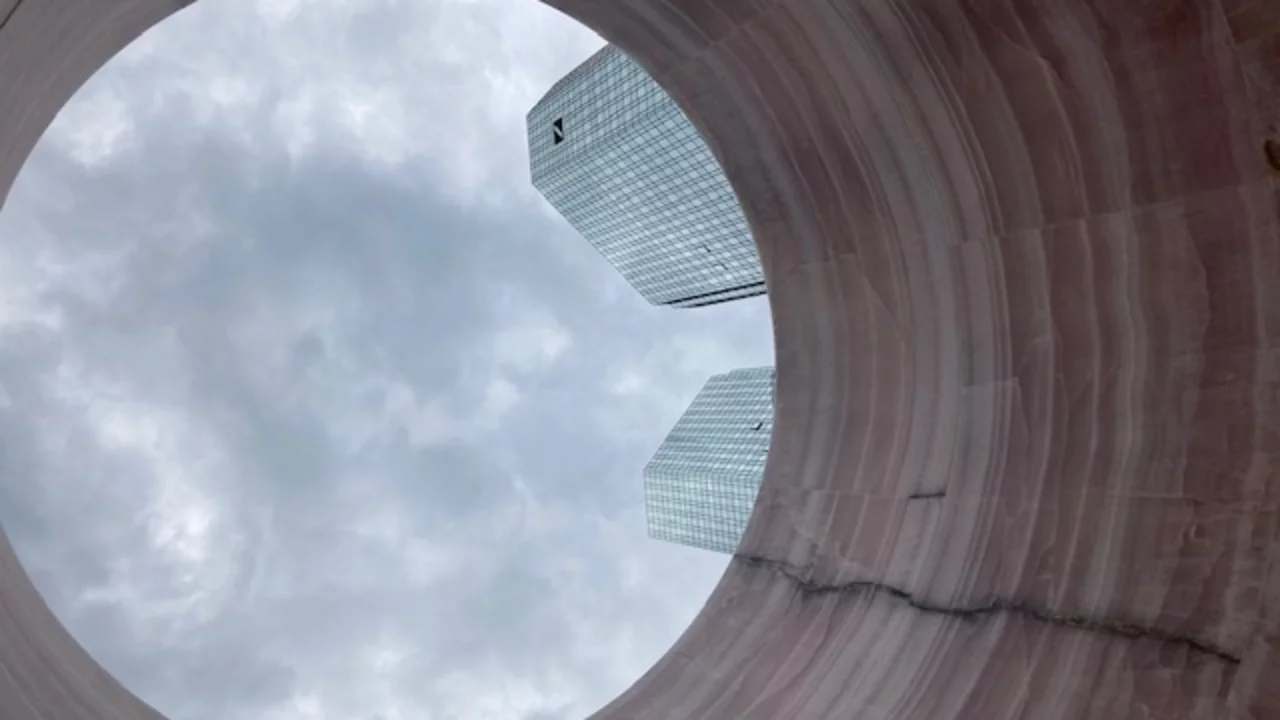 Vor kurzem habe ich im Frankfurter Bankenviertel einen spannenden Ort entdeckt. Ich bin durch den Grünstreifen in der Taunusanlage spaziert, der ist da mitten in der vierspurigen Straße. Lauter Verkehr war um mich herum, die zwei Türme der Deutschen Bank haben wichtig in den Himmel geragt. Da sehe ich einen etwa vier Meter hohen Zylinder aus dunklen Blechplatten, wie so ein Lüftungsschacht. Er hat eine Tür, die steht ein bisschen offen, ich schaue rein und bin sehr erstaunt: Innen ist dieser Blech-Zylinder mit einem sehr schönen rosafarbenen Stein verkleidet, etwas marmoriert. Ich schließe die Tür und stehe auf einem offenen Gitter aus kreisförmigen Metall-Ringen.