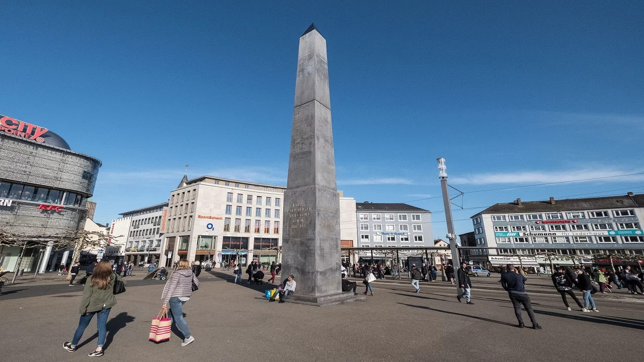 Den Kasseler Königsplatz ziert zur Zeit ein Obelisk, 16 Meter hoch. Ein Kunstwerk im Rahmen der documenta 14.