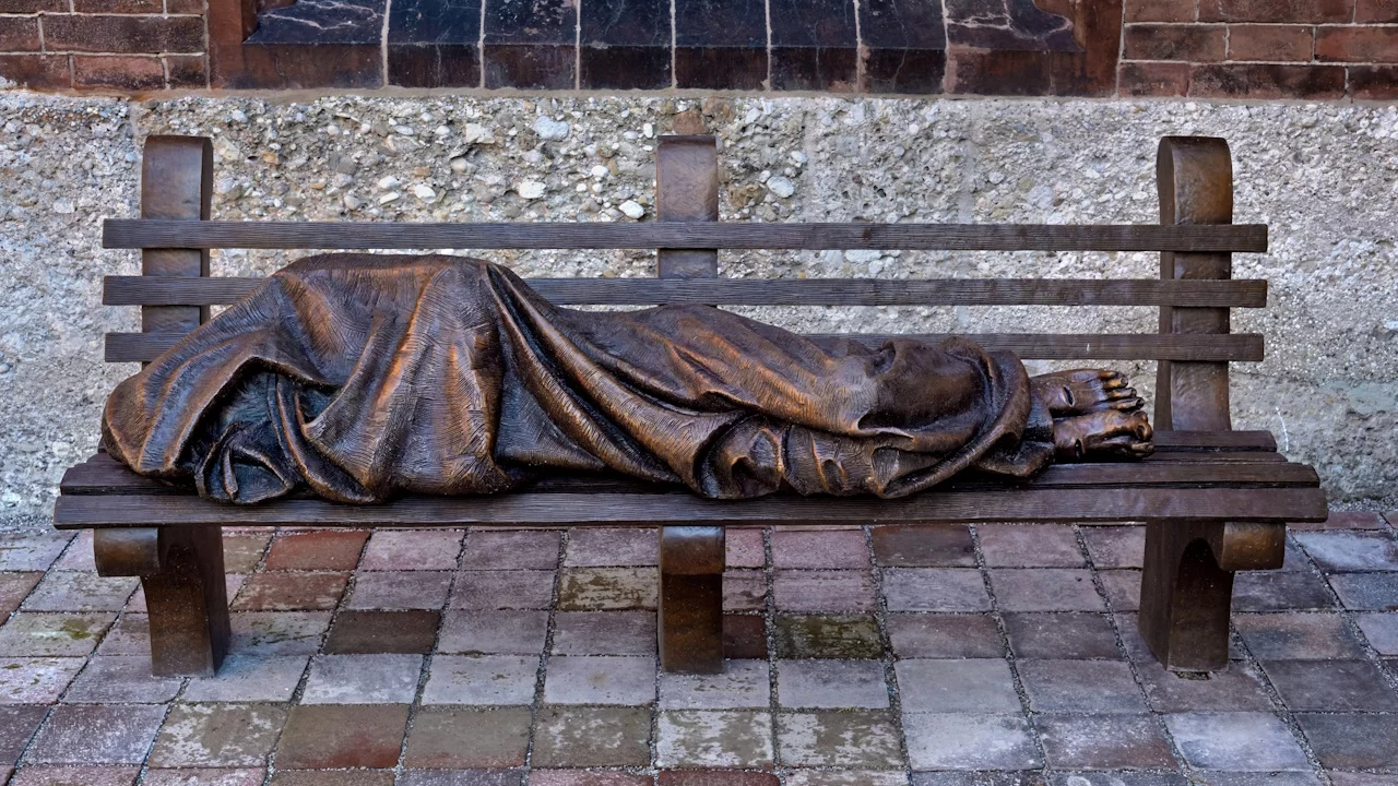 Guck mal, Mama, da liegt einer. Das Kind zeigt auf eine Parkbank. Tatsächlich, da liegt einer. Als die Mama dann genau hinsieht, erkennt sie, dass die Bank und der Mensch aus Bronze sind. Es ist ein Kunstwerk. Und als das Kind genau hinsieht, erkennt es Wunden an den Füßen des Mannes. Da liegt kein echter Mensch. Das soll Jesus sein.* Er liegt da wie jemand ohne ein Dach über dem Kopf. Davon hat Jesus einmal gesprochen und gesagt (Lukas 9,58): Ich habe nichts, wo ich mein Haupt hinlegen kann.